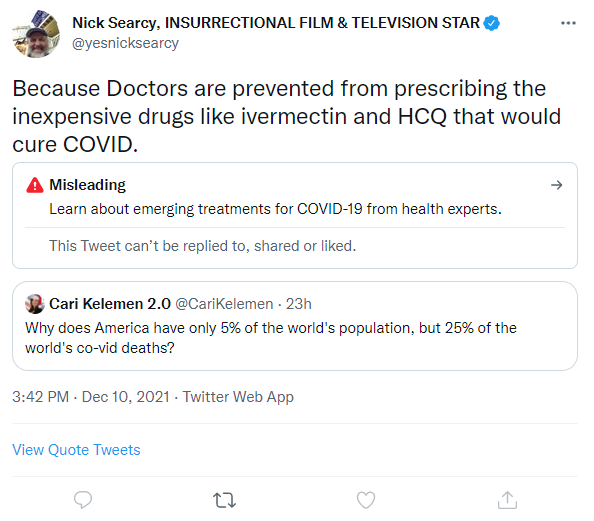 In this case, Nick made the mistake of saying that inexpensive drugs could treat and cure your Covid – that is backed by medical evidence – but runs afoul of the AI bot’s leftist parameters. Twitter bots have become arbiters of science fiction and fact.